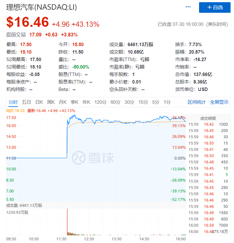美国时间7月30日,国产新能源汽车品牌理想汽车正式在纳斯达克挂牌上市,上市首日股价收涨43.13%,最高涨幅超过52%,当日市值一度达到148亿美元,超过了此前在美股上市的蔚来汽车。