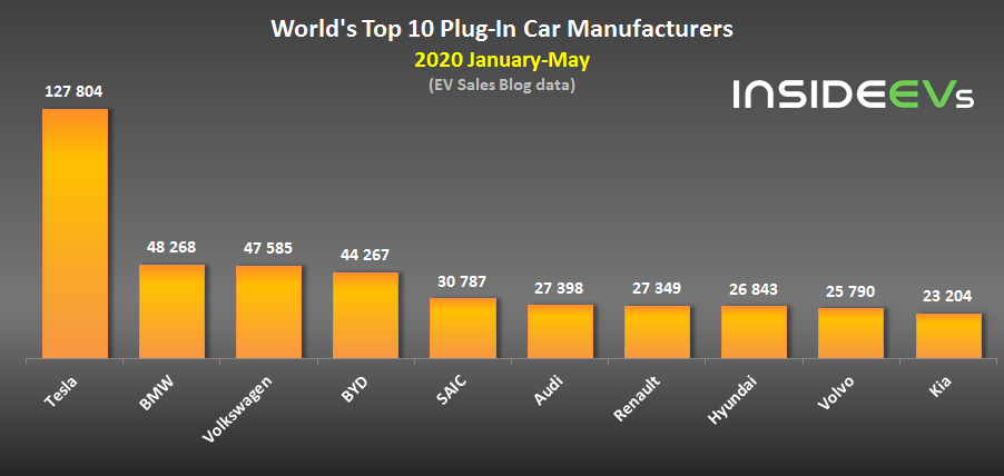 公开数据显示,今年1-5月全球插电式电动车品牌销量排行榜中,特斯拉、宝马、大众、比亚迪等车企位居前列,而国内知名的新造车企业没有一家进入前十。