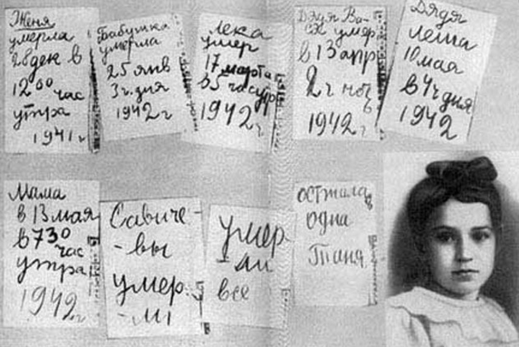 女孩Tanya Savicheva用日记记录了全家老少相继死去的经过。最后她也因饥寒而死。