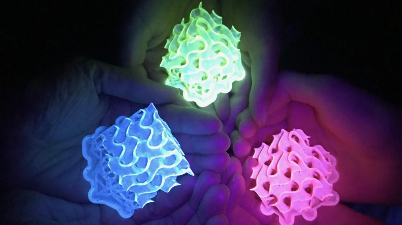 它们发出持续稳定的光芒,如同80年代旧餐馆里的灯光。这是由3D打印出的物体,可以将荧光染料的光亮发挥到前所未有的水平。发明者们说,它是目前有机和无机材料里最亮的一种,可以高效吸收光线。