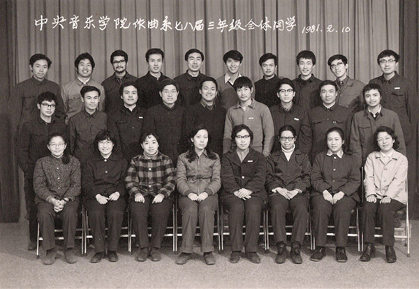 中央音乐学院作曲系1978级合影(注: 非1978届)。叶小纲(第三排右五)、谭盾(第二排右四)、郭文景(第二排右三)。