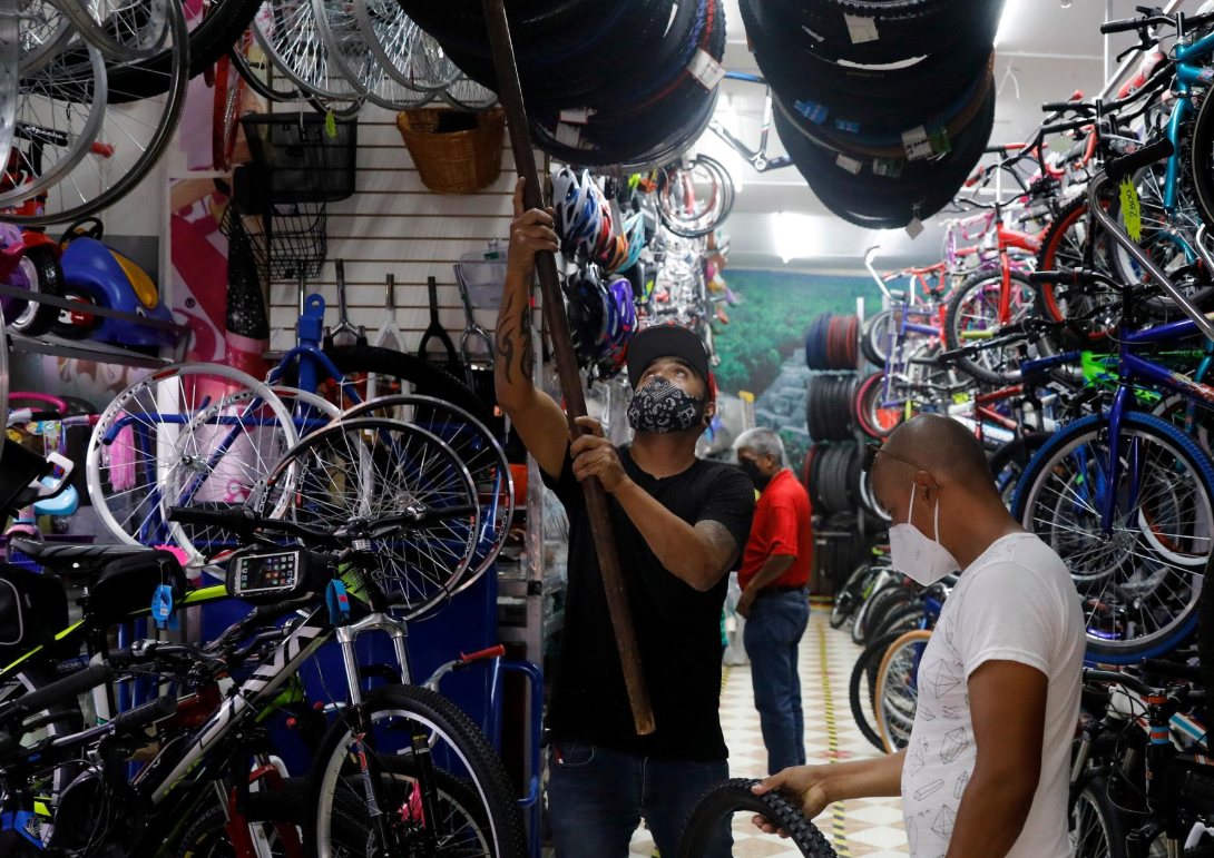 新冠疫情在墨西哥城持续爆发,一名男子在一家商店里查看自行车零件/图源:路透社