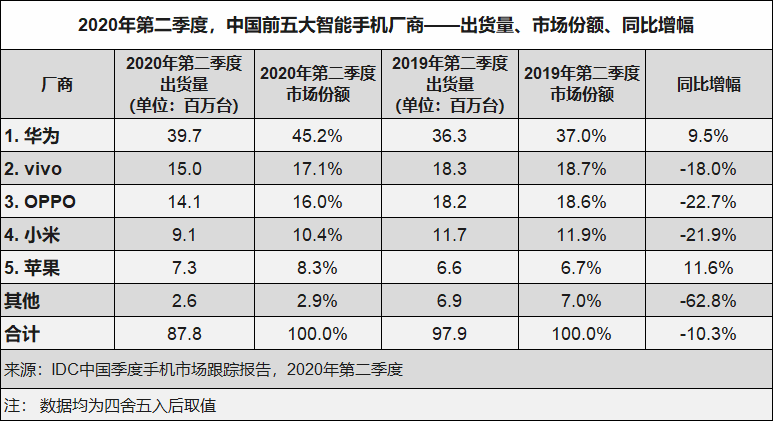 2020年Q2中国智能手机出货量排行,来源:IDC