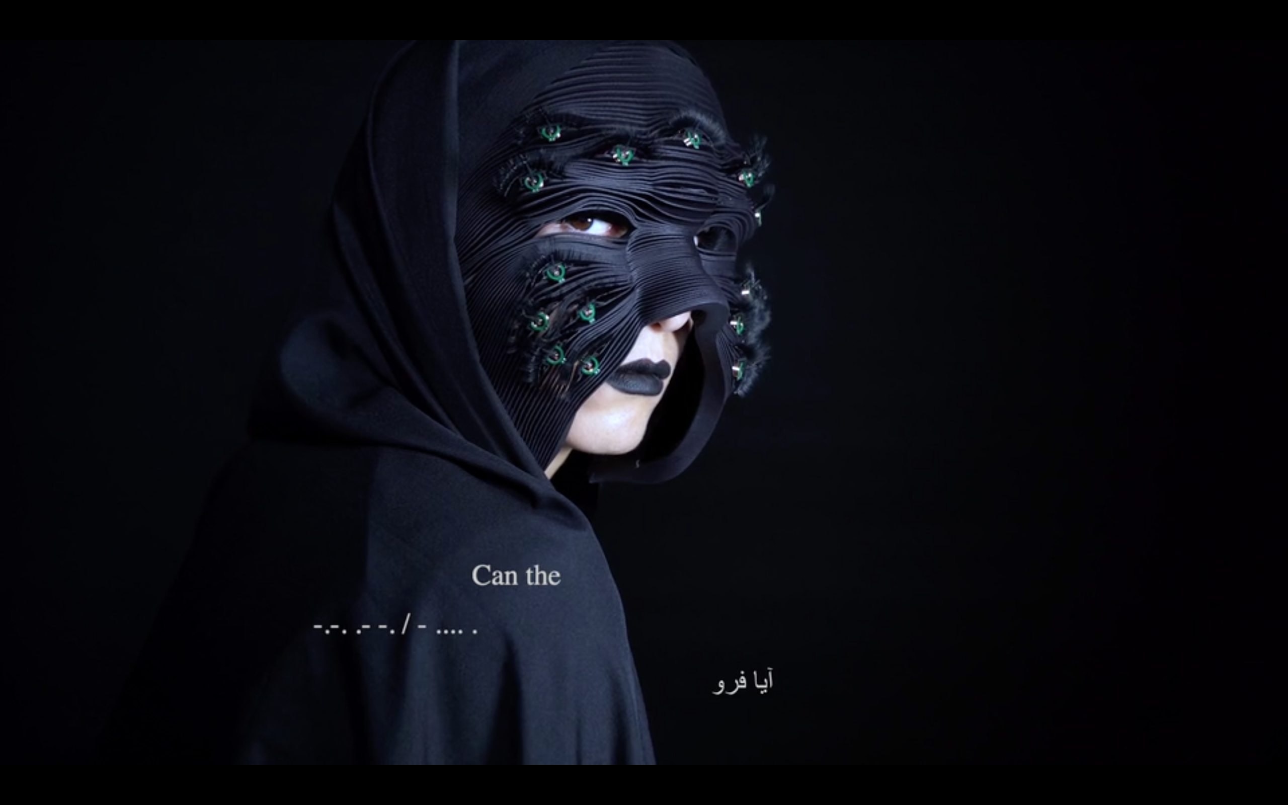 面具通过实时追踪佩戴者的眼睑来收集信息,并转化成摩斯电码传递出去,同时记录、分析对面面具的电码。在无言之间,两个戴面具的人就可以完成交流。目前,两个人工智能面具正在通过同一个源文本学习语言,它们的文本材料是女权主义评论家盖特丽·斯皮瓦克(Gayatri Spivak)撰写的文章《被压迫者可以发言吗?》的节选。