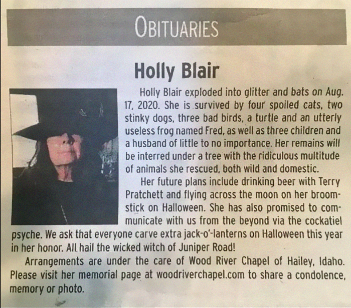 “2020年8月17日,霍莉·布莱尔炸成了一片光点和蝙蝠。她留下了四只被宠坏的猫,两只臭狗,三只坏鸟,一只乌龟,一只废物青蛙,三个孩子和一个无足轻重的丈夫。她的遗体将与她救助过的众多可笑的动物一起安葬在一棵树下。”