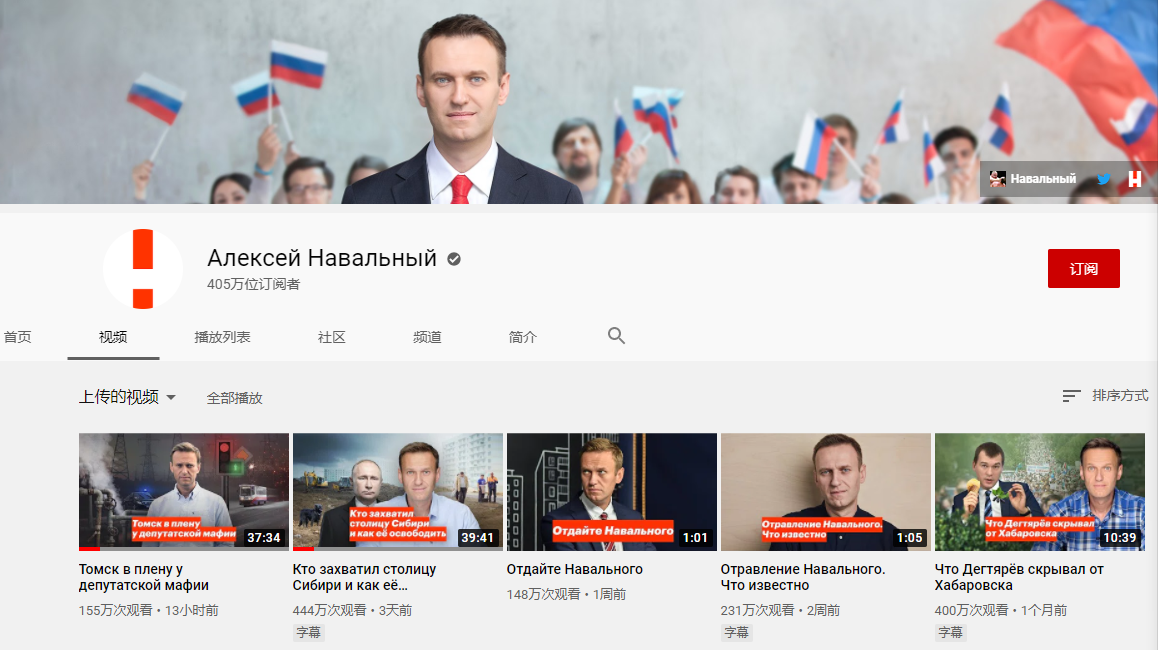 作为俄罗斯国内最主要的反对力量,纳瓦尔尼能够熟练地使用各类社交媒体,凭借400多万的Youtube粉丝和225万的推特粉丝,让他在互联网上拥有极大话语权。