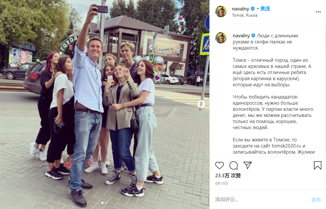 这次行程让他非常愉快。他走了许多地方,会见了当地反对派成员,还在汤米河里畅游了一番。“这是一个很棒的城市”,纳瓦尔尼甚至兴致高昂地在社交媒体Instagram上发了一个在西伯利亚的动态,配图是他在托木斯克和当地一群年轻支持者的合影。