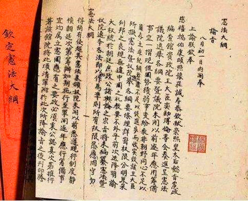 公元1908年,清廷以光绪皇帝的名义颁布《宪法大纲》,史称《钦定宪法大纲》。