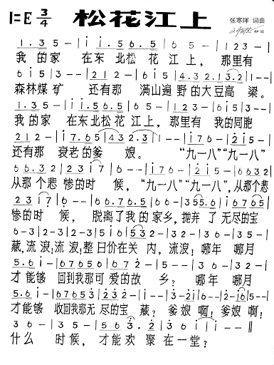 《松花江上》是1935年张寒晖在西安目睹东北军和东北人民流亡惨状而创作的一首抗日歌曲。