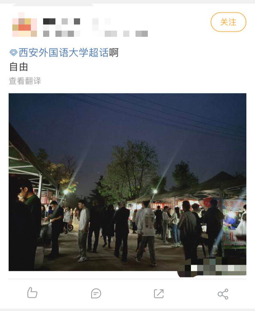 9月22日晚,西安外国语大学的超话下,有学生晒出外出就餐的图片。(图片来源:微博截图)