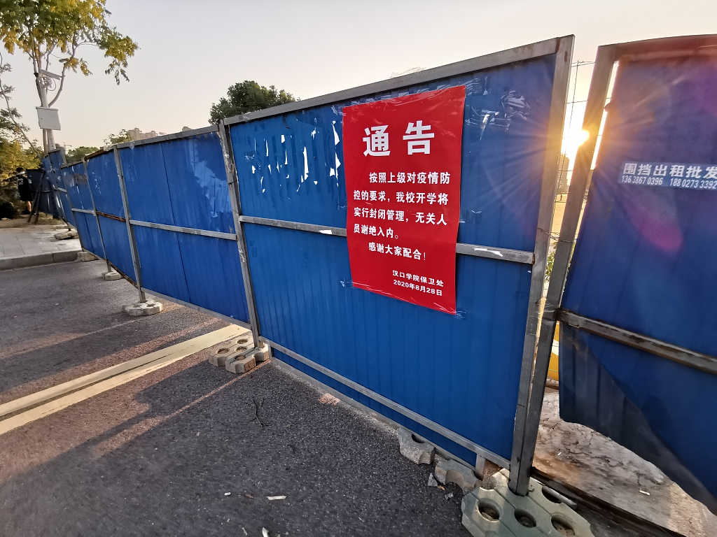 2020年9月4日,武汉汉口学院,打围的围挡上张贴着保卫处的通告“接上级对疫情防控的要求,我校实行封闭管理,无关人员谢绝入内”。(图片来源:CFP)