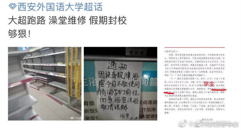 西安外国语大学的超市、澡堂相继出现问题。(图片来源:微博截图)