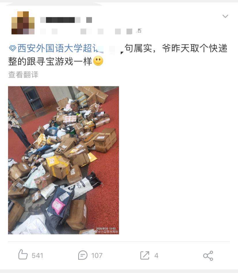食堂和超市出现问题,外卖又不被允许,学生们便转向快递——但单量很快使快递站爆仓,在西外,中通快递爆仓,大量没派送的快递堆在地上,赶上秋雨,不少纸箱纸盒被泡烂在雨水里。