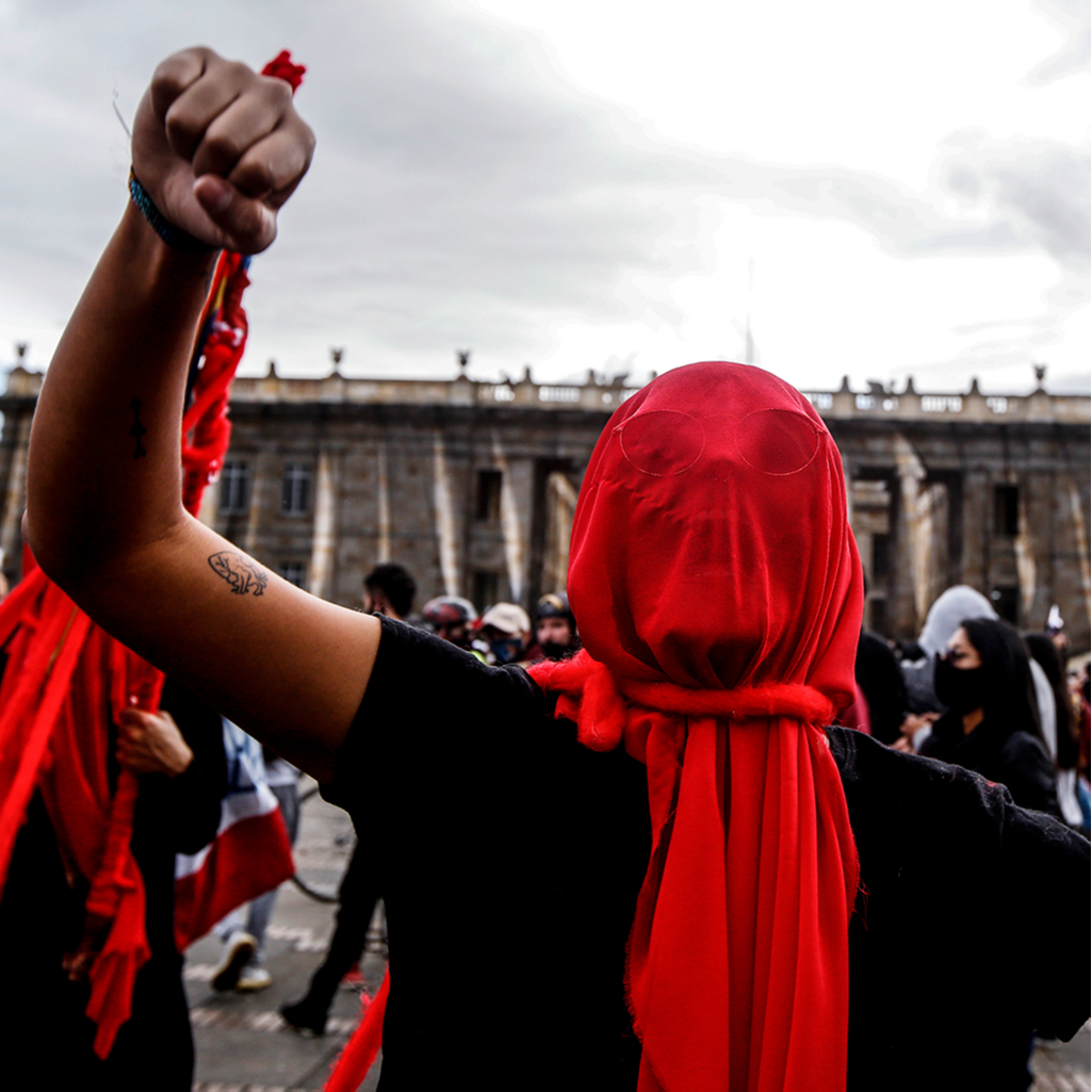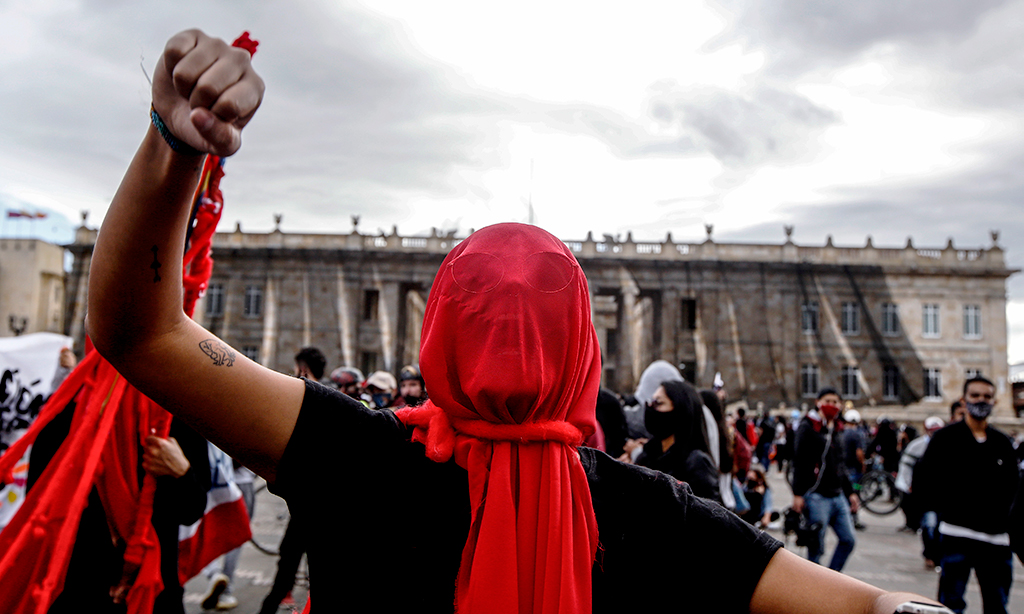 9月21日,在首都波哥大爆发的反警察暴行抗议活动上,示威者向防暴警察挥舞拳头。46岁律师哈维尔·奥尔多涅斯于9月9日死于警察暴力执法后,示威浪潮在哥伦比亚各地持续发酵。9月21日,数千民众集结街头抗议警察暴行及政府政策,工会成员和学生为主要成员,他们高呼反警察暴行口号,并与警察发生激烈冲突,示威者向警方投掷石头,警方则以催泪瓦斯和闪光弹回击。警方表示,已有至少5600人举行了142场抗议活动,造成数百人死伤,超40%警察站、公交车站等公共设施损毁严重。图片:Leonardo MUNOZ / AFP