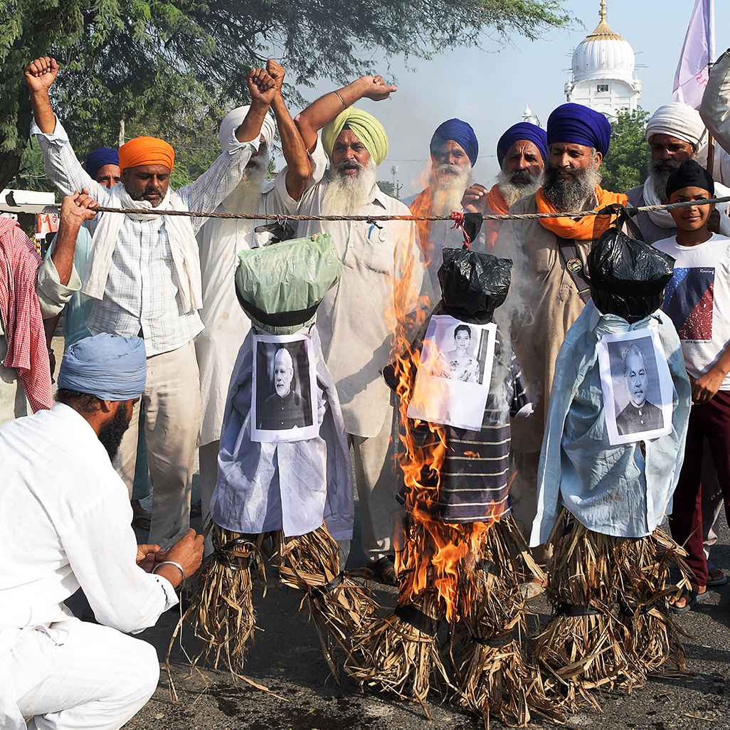 9月22日,农民焚烧印度总理纳伦德拉·莫迪(左),农业部长纳伦德拉·辛格·托马尔(右)和宝莱坞女演员康纳娜·拉瑙特(中)肖像并高呼口号,以抗议印度联邦院通过的两项农业改革法案。新法案剔除农业批发市场等粮食贸易中间商,让农民直接销售农产品给大企业 。反对派及农民表示强烈不满,该法案将削弱农民的议价能力,大型零售商有了操纵农产品价格的权利。国大党高级领导人拉胡尔•甘地(Rahul Gandhi)在推特公开指责,莫迪正在让农民变成资本家的“奴隶”。印度农业过去30年持续下滑,GDP占比从三分之一锐减至15%。印度国家犯罪记录局数据显示,超50%农民负债累累,2018年和2019年有20638名农民自杀。图片:NARINDER NANU / AFP
