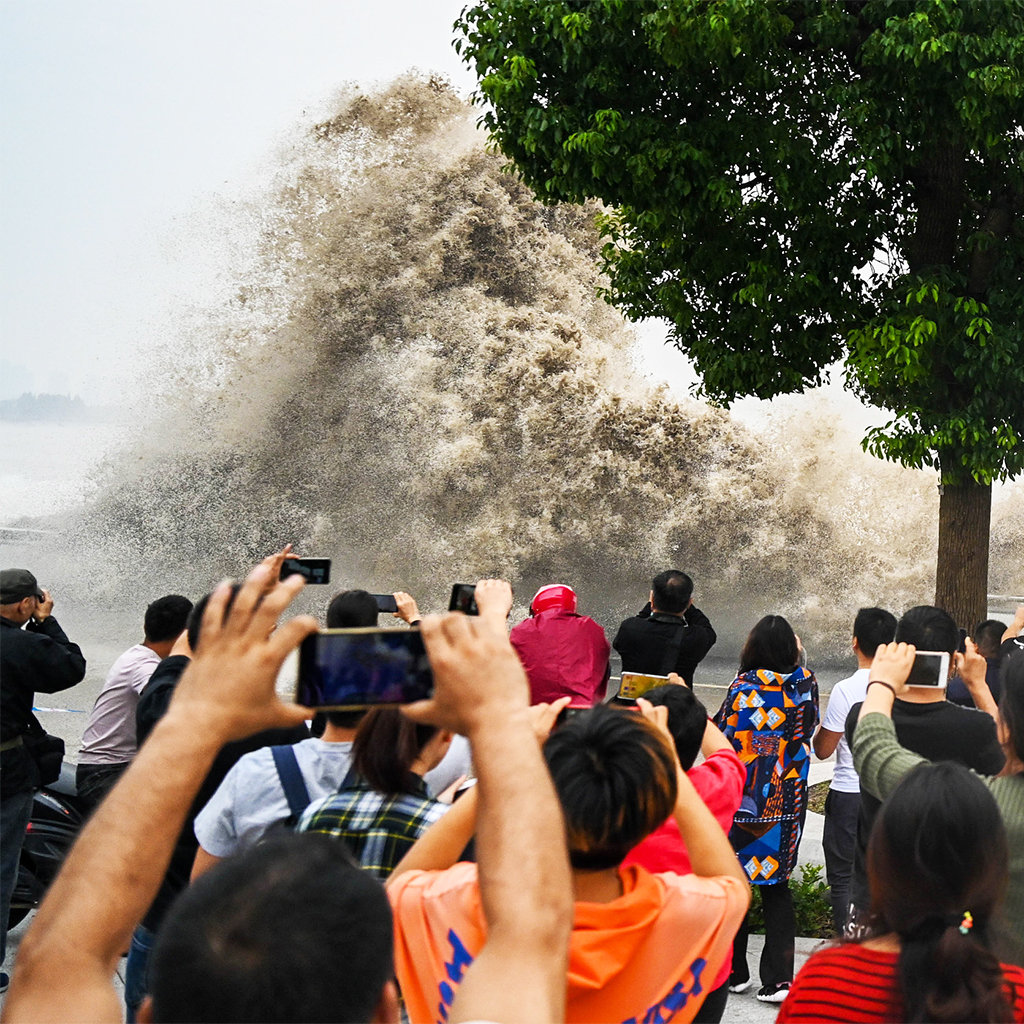 9月21日,农历八月初五,钱塘江大潮日,奔涌而来的钱江潮在杭州下沙七格江堤翻卷上岸,激起6米多高的巨浪。市民和游客在安全线外有序观潮,现场有惊无险。钱江潮最大的是秋潮,发生在农历七八九三个月,潮水壮观。每年农历八月十五,钱塘江涌潮最大,潮头可达数米。相传农历八月十八是潮神生日,潮峰最高,因此农历8月18日前后三天为观潮节。除此之外,农历每月初与月中皆有大潮可观,并可作一潮三看“追潮游”。图片:董旭明/视觉中国
