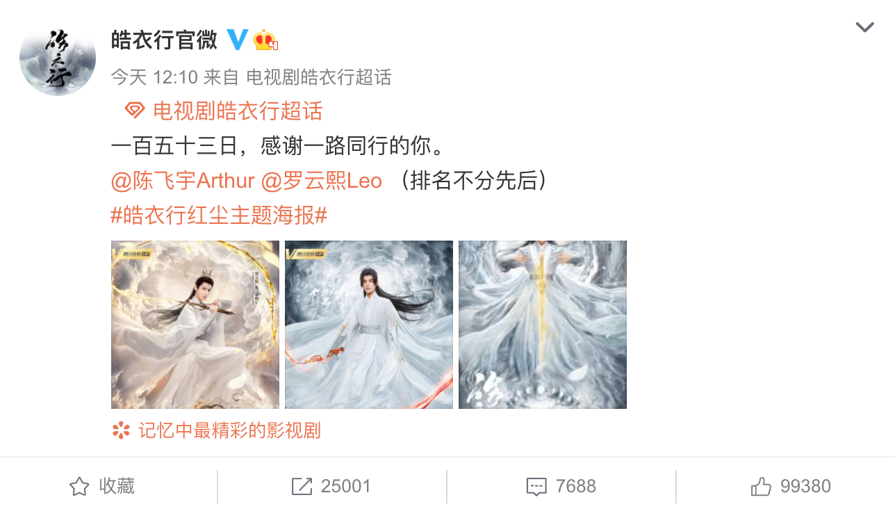 电视剧《皓衣行》宣布罗云熙,陈飞宇杀青,“排名不分先后” -电视剧《皓衣行》近日在横店影视城杀青,官方微博发布了这一单人海报,曝光了两个主演罗云熙,陈飞宇的黑衣和白衣造型,为了避免“撕裂位”,特别注明“排名不分先后”。