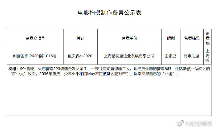 1994年的电影《重庆森林》是很多影迷心中的经典之作。20年后,新版《重庆森林2020》要来了。根据备案立项公示,故事梗概为:90年代香港,失恋警察223偶遇金发女也经历失恋的警察663,生活渐被一位闯入的“梦中人”改变……
