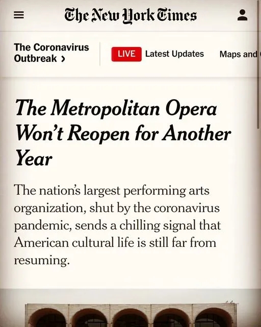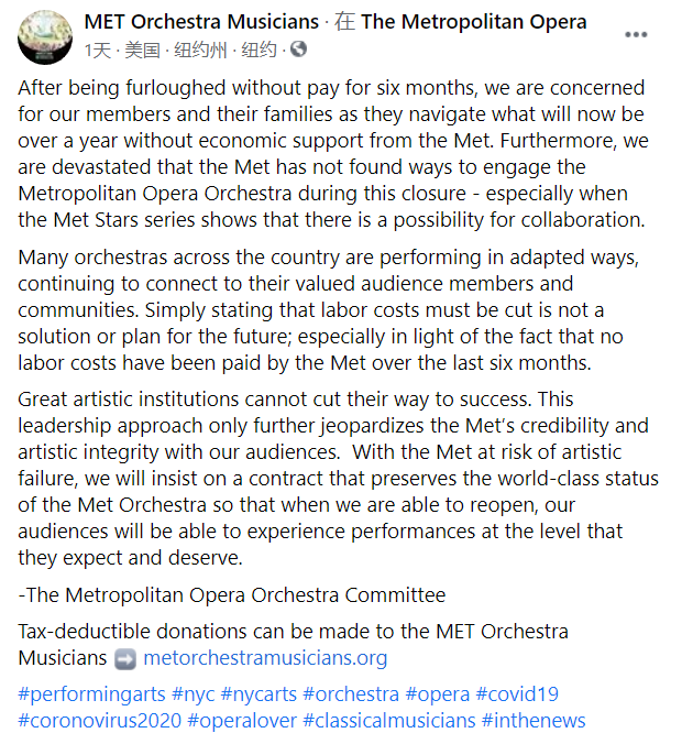 大都会歌剧院管弦乐团六个月未收到工资的音乐家们声明,表示“对大都会歌剧院在这次关闭期间没有找到合作的方法感到震惊”,哎,随大流才是多数人的鸵鸟选择……