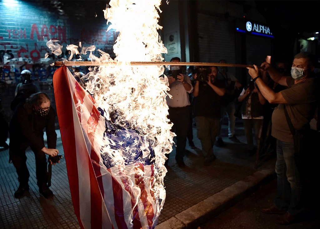 希腊 | 蓬佩奥访问期间,示威者焚烧美国国旗抗议