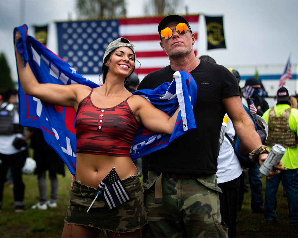 9月26日,在俄勒冈州波特兰市一处公园,几百名“骄傲男孩”及其他类似团体成员举行集会活动,其中一对情侣在镜头前舞蹈狂欢。极右翼组织“骄傲男孩”成员聚集在波特兰,表达对唐纳德·特朗普的支持,并谴责“黑人的命也是命”和““反法西斯主义者(Antifa)”抗议活动中持续三个多月暴力事件。“骄傲男孩”是一个极右翼的新法西斯组织,只接纳男性成员,并煽动和参与政治暴力事件。图片:Maranie R. STAAB / AFP