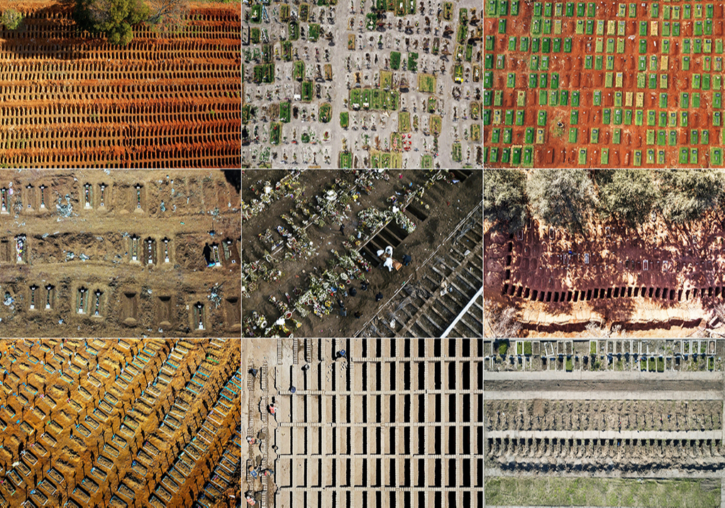 9月28日,这是一张由世界各地埋葬新冠肺炎逝者公墓的鸟瞰图组合而成的拼接图。据美国约翰斯·霍普金斯大学发布的统计数据,截至9月28日18时23分(北京时间29日6时23分),目前全球累计新冠肺炎死亡病例逼近100万例,达999629例。随着流感季的到来,美国公共卫生专家警示疫情将带来更大的风险。这场肆虐世界经济、加剧紧张局势的疫情迄今仍没有好转迹象,引发各界对疫情反弹的担忧。图片:AFP