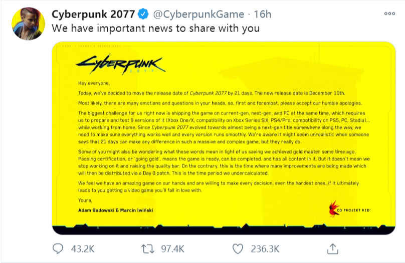 果不其然,CD Projekt Red在声明中表示,《赛博朋克2077》发售日期将再次延后21天,至12月10日。声明中制作方承认自己低估了游戏制作难度,遇到的主要挑战在于游戏在九种不同机型上运行的准备和测试。为了保证不出差错,向玩家提供最佳版本的游戏,这才导致了延迟。