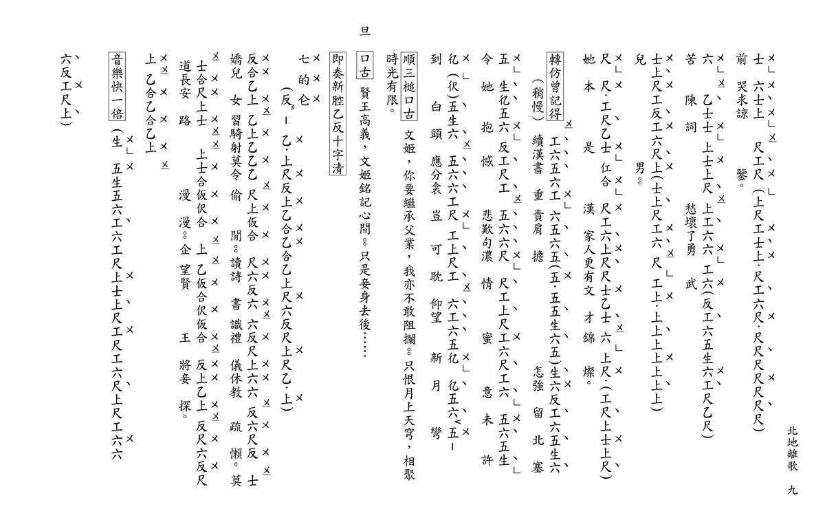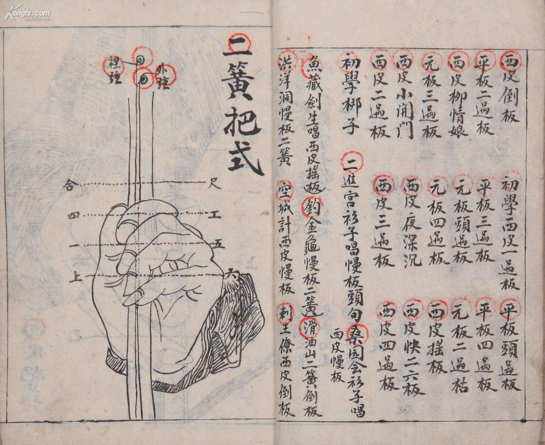 在民间还有以笛上的按孔或开孔的数目作为调名的。如三眼调、两眼调等。工尺谱中的强弱记号、反复记号、表情记号、速度记号等,都是用文字来标记的。有的记在工尺音字的左侧,有的记在板眼符号的右侧,也有的记在工尺音字的行间。