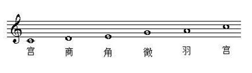 五声音阶常被称为“中国音阶”。其五阶在中国传统文化中有专用的名称,分别称为:宫、商、角、徵、羽,唐代时使用“合、四、乙、尺、工”。其音程组织是每个八度之内有3处全音,分成两个一串(宫-商-角)和一个单独的(徵-羽)。