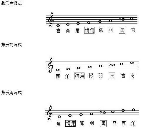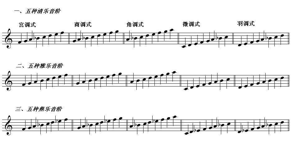 在五声音阶基础上,每处音的区间可以插入不同的附加音(偏音)而形成七声音阶(以五声为正声的七声音阶)、偏音有:变宫、变徵、清角、清羽,附加音的插入可有 3种不同的方式。