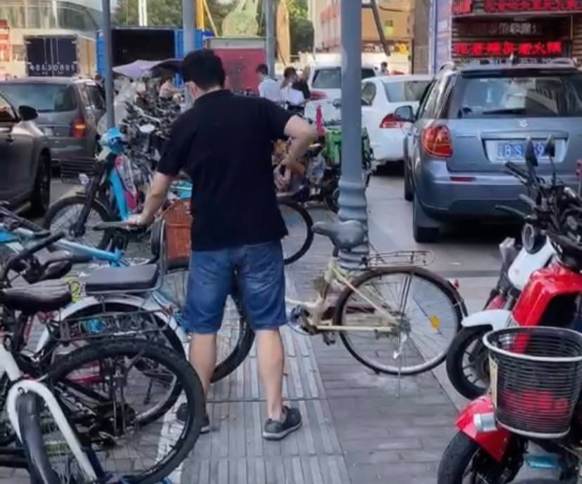 在抖音视频里,郑锐演示被单车挡住的盲道。(来源:“盲探小龙蛋”的视频截图)
