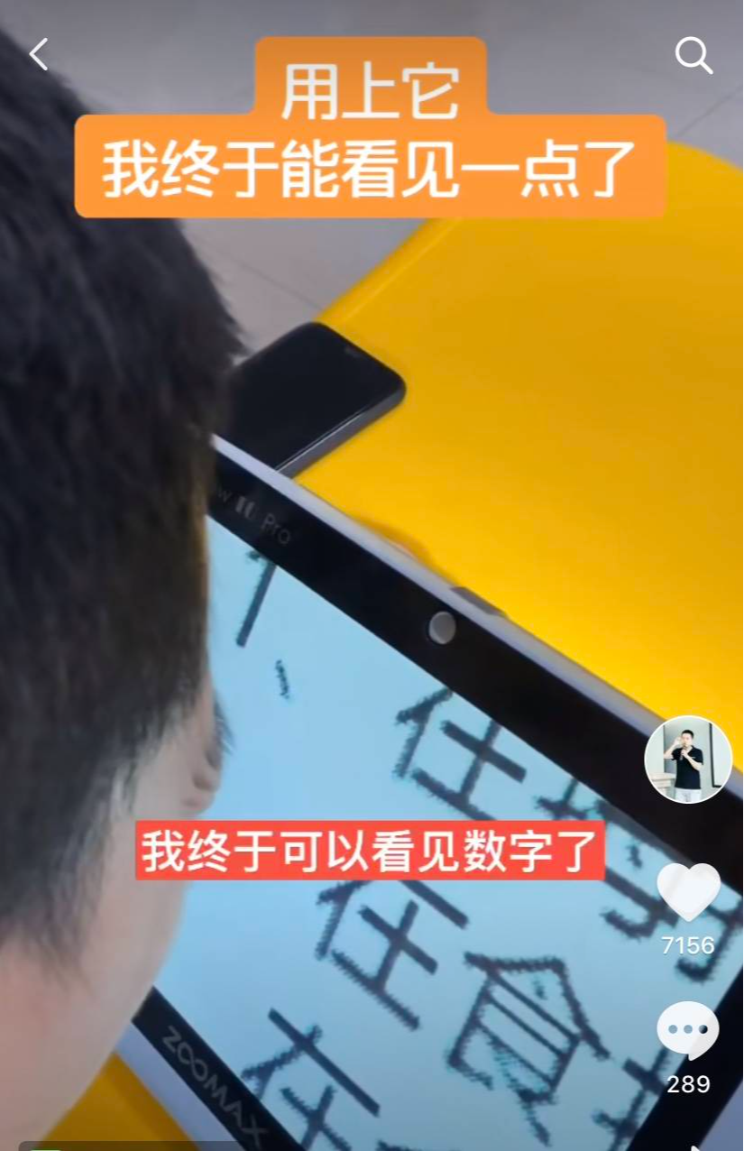 在使用辅助工具放大后,郑锐可以阅读文字。(来源:“盲探小龙蛋”的视频)