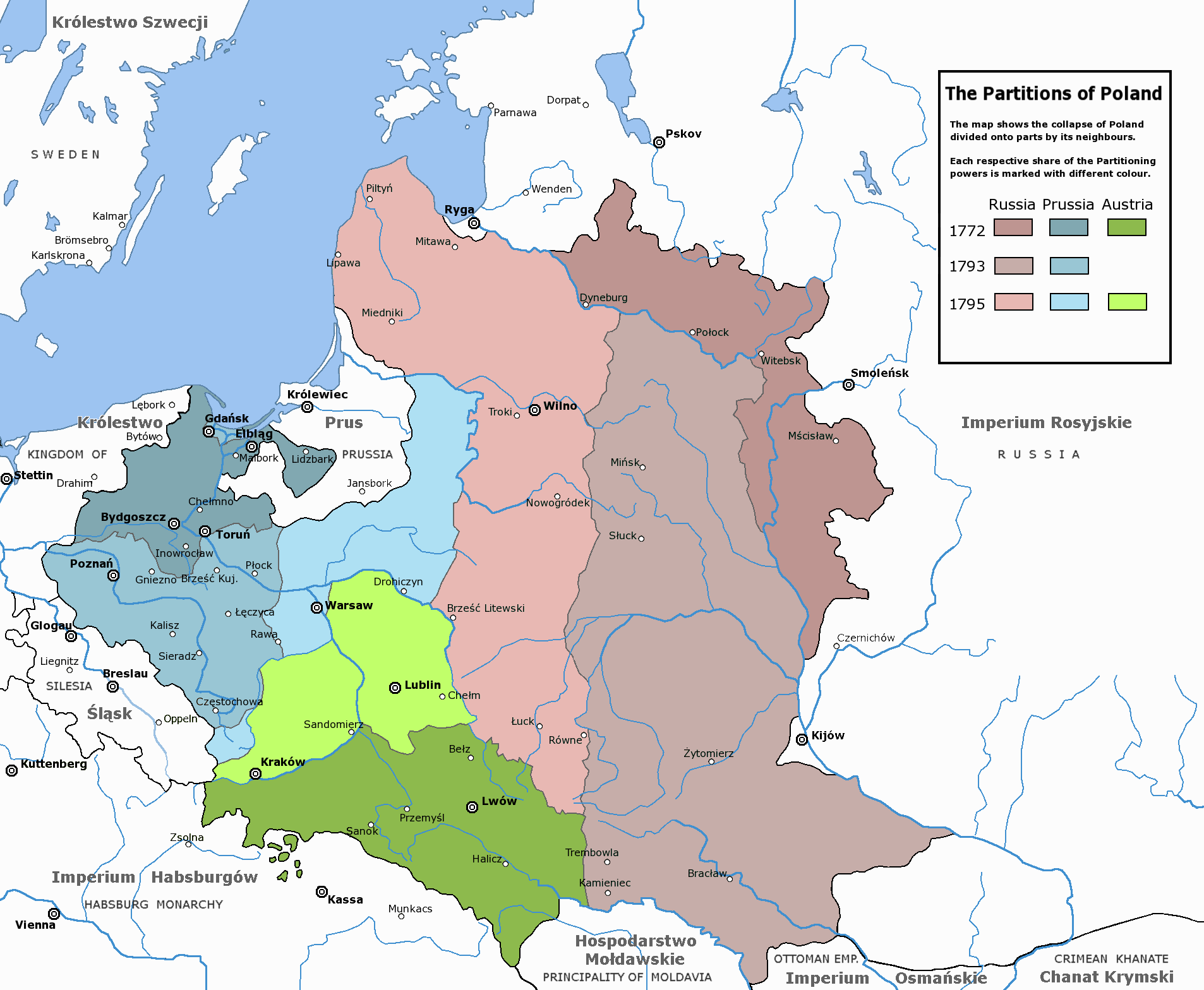 1772-1795年的瓜分波兰。彩色区域是波兰立陶宛联邦在被瓜分前的版图。蓝色区域(西北部)割让给普鲁士王国,绿色区域(南部)割让给奥地利帝国,棕红色区域(东部)割让给俄罗斯帝国。