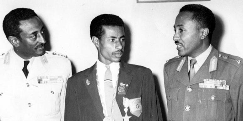 门格斯图·内韦(左一)与第一位非洲黑人奥运金牌获得者阿比比·比基拉(中)在一起