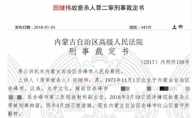 2016 年,内蒙古赤峰市第二医院放射科副主任田继伟被捕,因不满主任张某,在长达两年的时间内,田继伟在张某的水杯中投放其精心调制的药物。