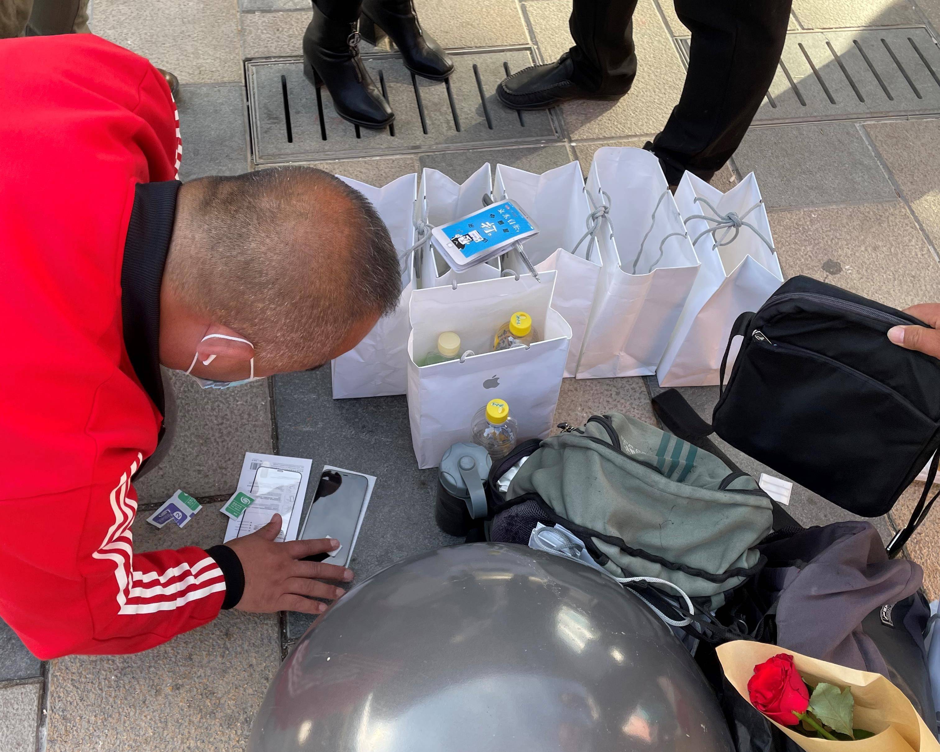 阿昌的同事正在三里屯Apple门店外给客户贴膜。图片:全现在