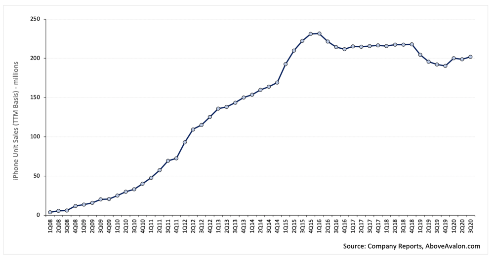 iPhone 12系列的销售火爆,让不少投资者看见了苹果重回销量顶峰的希望。据统计网站Above10月26日发布的最新数据显示,iPhone 近年来的销量不断走低,其销量最高峰停留在了2015年。